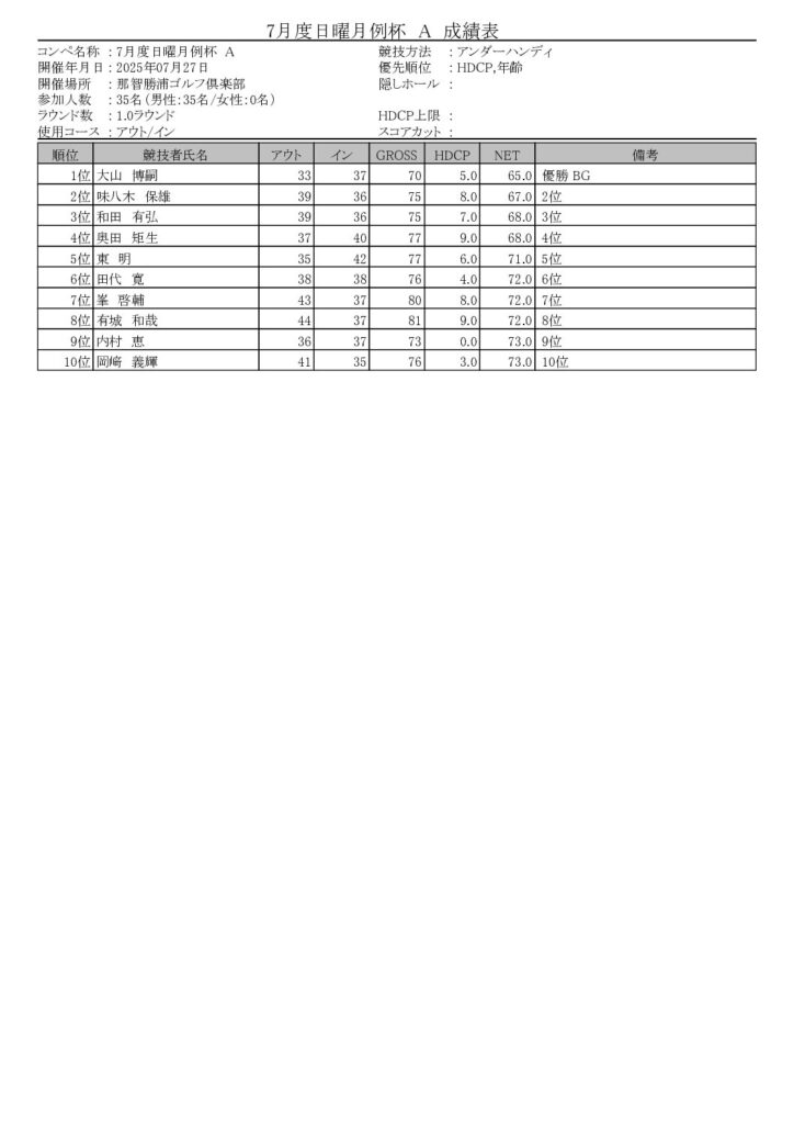 7月度日曜月例杯を開催しました 競技 Twitter Facebook はてブ Pocket LINE コピー 2025.07.27 7/27(日)7月度日曜月例杯がAクラス35名Bクラス71名・Cクラス21名・OP4名で 行われました。 入賞者は以下の通りです。 202507_日曜月例杯成績表A(入賞者)ダウンロード 202507_日曜月例杯成績表B(入賞者)ダウンロード 202507_日曜月例杯成績表C(入賞者)ダウンロード