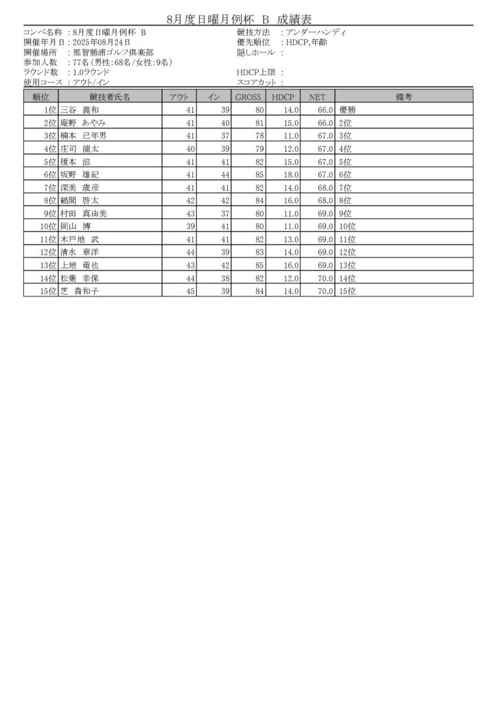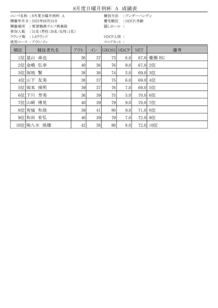 8月度日曜月例杯を開催しました 競技 Twitter Facebook はてブ Pocket LINE コピー 2025.08.24 8/24(日)8月度日曜月例杯がAクラス31名Bクラス77名・Cクラス28名・OP5名で 行われました。 入賞者は以下の通りです。 202508_土曜月例杯成績表A(入賞者)ダウンロード 202508_日曜月例杯成績表B(入賞者)ダウンロード 202508_日曜月例杯成績表C(入賞者)ダウンロード