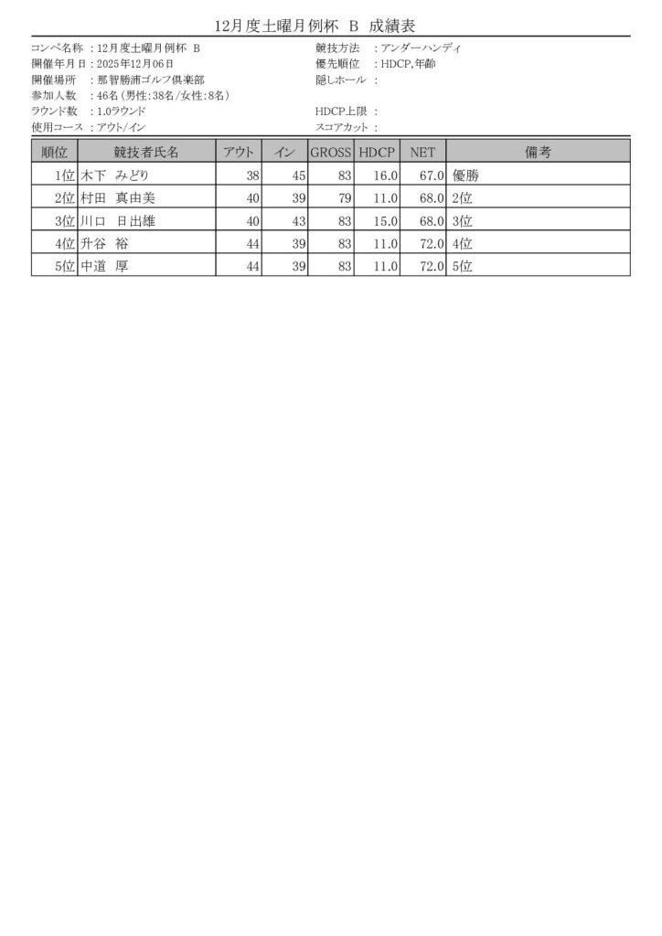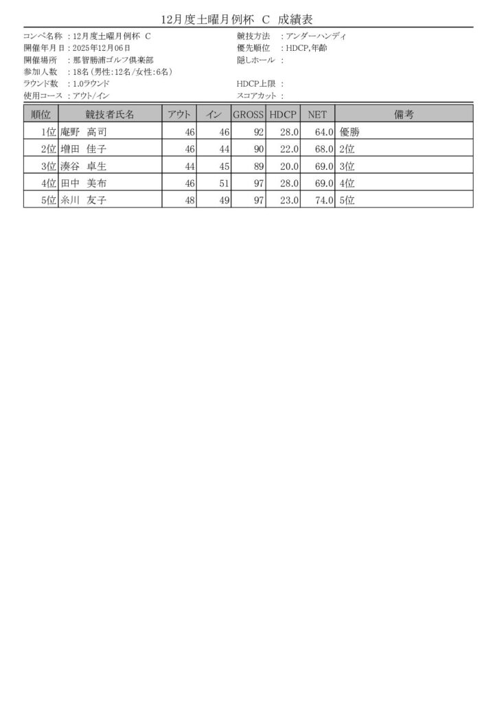 12/6(土)晴天の中、12月度土曜月例杯がAクラス8名