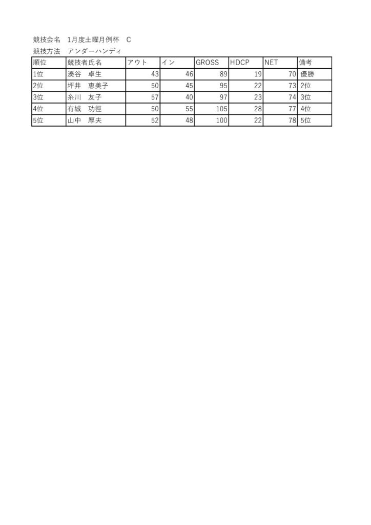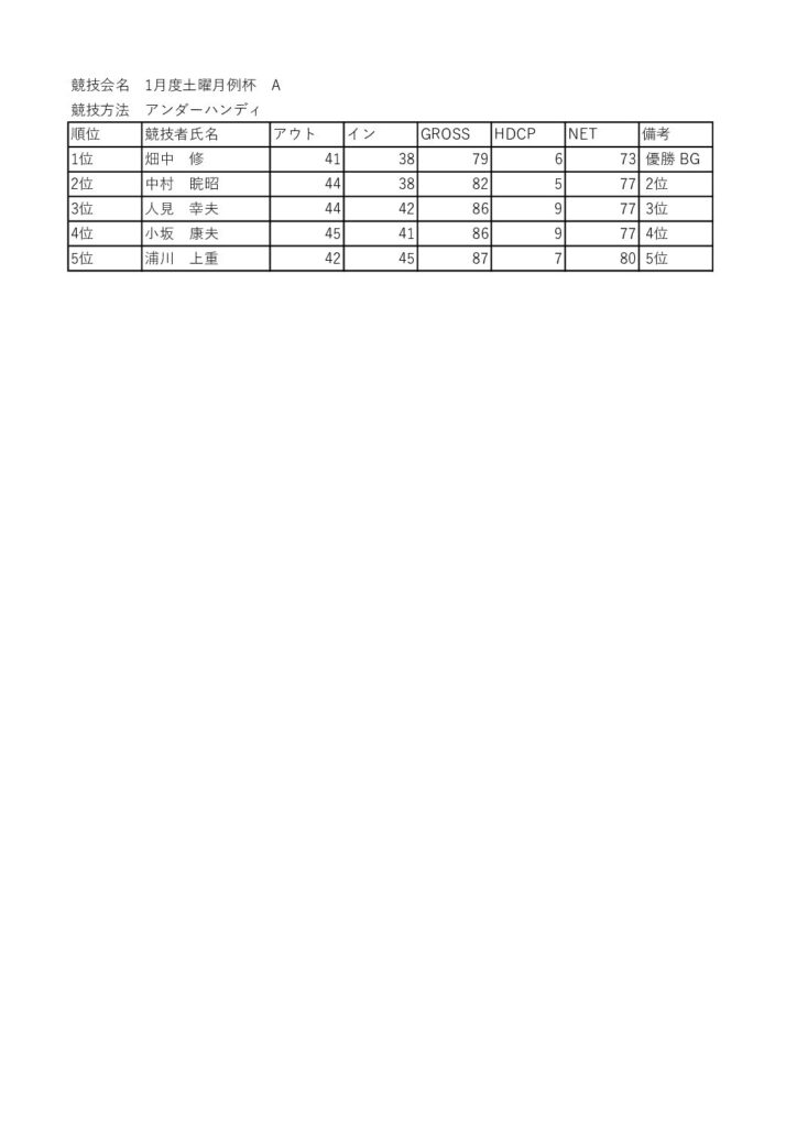 1月度土曜月例杯を開催しました 競技 Twitter Facebook はてブ Pocket LINE コピー 2026.01.24 1/24(土)晴天の中、1月度土曜月例杯がAクラス9名Bクラス54名・Cクラス20名・OP3名で 行われました。 入賞者は以下の通りです。 202601_土曜月例杯成績表A(入賞者)ダウンロード 202601_土曜月例杯成績表B(入賞者)ダウンロード 202601_土曜月例杯成績表C(入賞者)ダウンロード